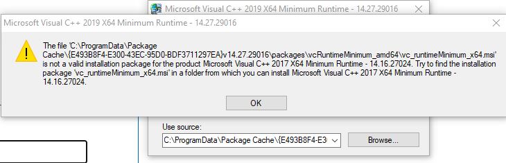 When I manually select "C:\ProgramData\Package Cache{E493B8F4-E300-43EC-95D0-BDF3711297EA}v14.27.29016\packages\vcRuntimeMinimum_amd64\vc_runtimeMinimum_x64.msi"