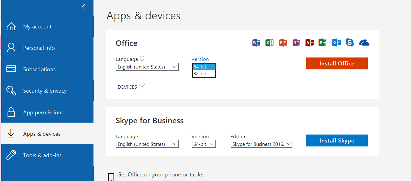 If you want to install 32-bit Office package, you should completely uninstall 64-bit Office first. Once the uninstall is complete, sign in again to www.office.com and select Other install options, choose the language and version you want (64 or 32-bit), and then select Install.