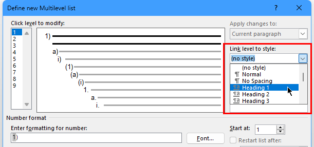 These can be built-in styles or custom styles or a mix of the two. You can, if you want, modify their formatting later. Then you go to the Define New List Style (Not Define New MultiLevel List! You will get to that dialog in the process, though.) Shauna Kelly's page uses the built-in heading styles. This can be convenient but the process works with any existing paragraph styles including your custom styles.