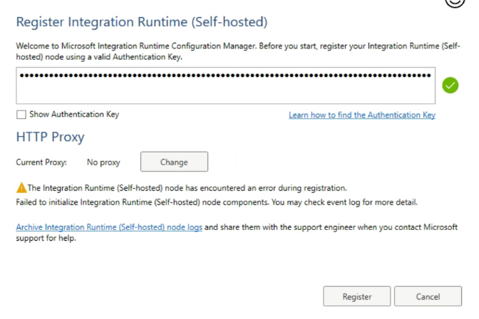"The integration Runtime (Self-hosted) node has encountered an error during registration.
