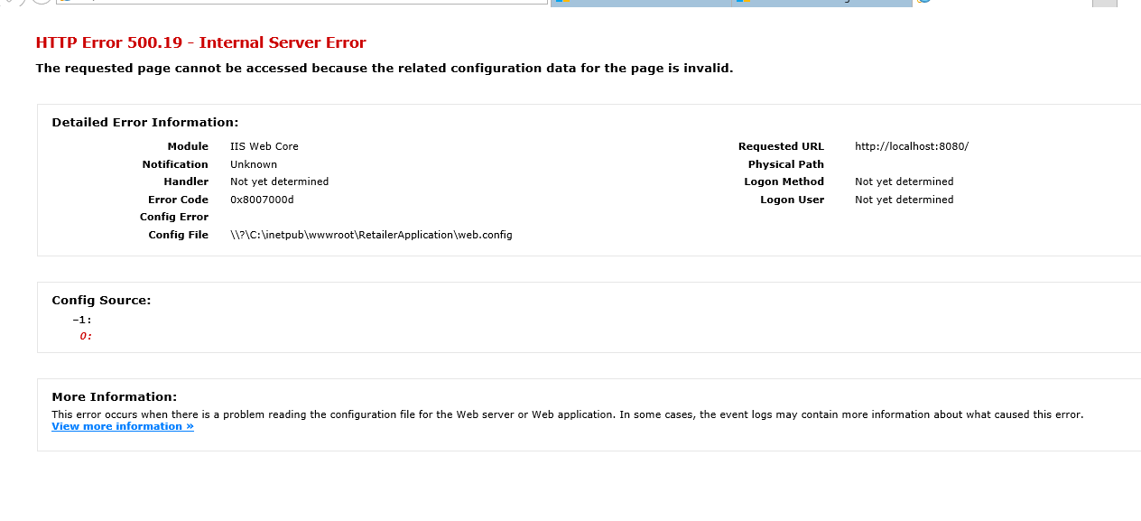Attached in screenshot of the error and web.config