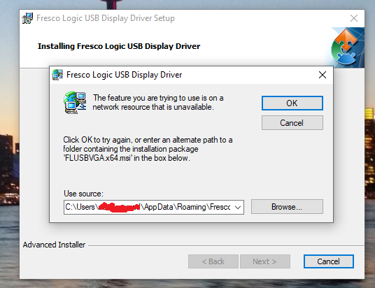There are a couple way to work around this. By default, I see the source is pointing to %appdata%\Fresco... Select the Browse option in that Window and change the path to where you downloaded the installer package (which I assume is a .msi file).