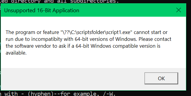 Is it possible to write a DOS script to run in Windows 10? Just the good old fashioned DOS commands written into an executable (.exe) file. When I wrote a script with a .exe extension and try to run it I just get this message. I just wrote it in Notepad, saved it as "script1.exe", and tried to run it and get the message below.