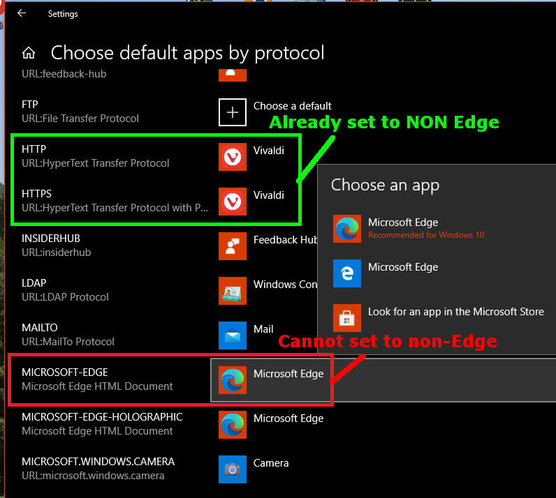 The HTTP and HTTPS default app was already set to non-Edge, asyou can see in green below, which is what I'd hope and expect since I'd set my default browser to non-Edge.