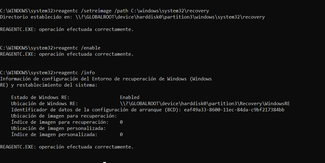 Again, thanks for the screenshots. Although everything seems to be in order, it's strange that the code to re-enable WinRe is not working. We will now try to manually set the path in case there is any issue with the default one. To do this, run the following commands from CMD as an administrator: