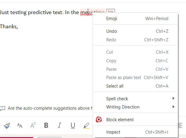 Thanks for that, but sadly not working for me. I use Outlook through my browser (Chrome) and the right click context does not bring up the predictive text option you describe. Here is what I get: