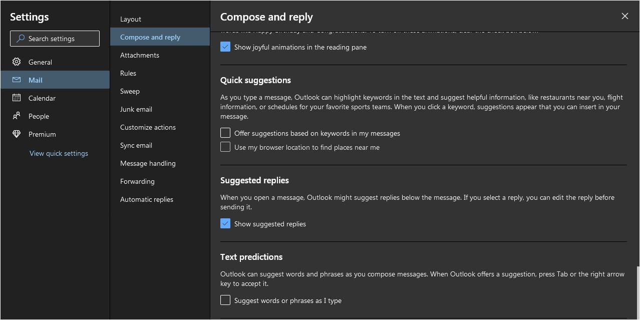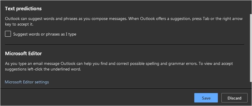 Just recently while I've been making emails in outlook I'll get some grey text that appears in front of the characters I've actually typed out and there is a little tab key icon at the end of the greyed text that completes the sentence with the greyed out suggested text included if I press tab. I was wondering how to turn off this predictive text feature when typing? I think an odd sign-out situation occurred recently where my original settings for outlook were returned to the default, which then started this annoying phrase guessing feature. I've disabled text suggestions on my laptop settings but I still have get the text suggestions on outlook mail. Settings for outlook itself hasn't shown anything that might control predictive text either, so I'm not sure how to turn the feature off.