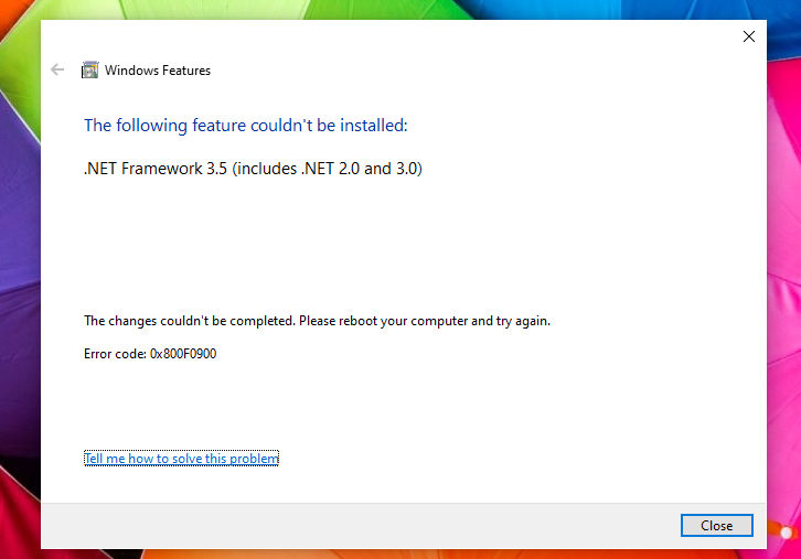 I have this failure over and over again when trying to install the .NET framework 3.5. I looked up for this error but there isnt a correct code
