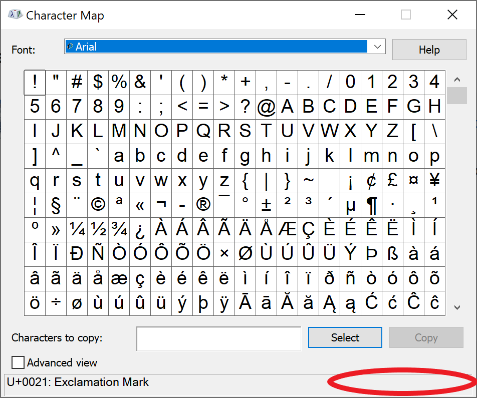 2021-02-15T00:17:57+00:00 I think in older versions of Character Map there was an indication of the ASCII code of each character in the lower right corner (where I've placed the red circle), in addition to the Unicode one in the lower left one, which appears now. Does anybody know how to add it? If this were visible, I could rapidly consult the ASCII code of a desired character and then use the ALT+<numeric code> command to insert it when desired.