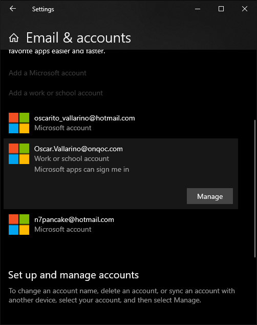 The place to start for this is Settings > Accounts > Access Work & School. Find and highlight the account to Disconnect. Now you should be able to remove it. Make sure it's removed there, in Settings > Accounts > Family & Other Users, in Settings > Accounts > Email and other Users. Restart PC in between each operation.