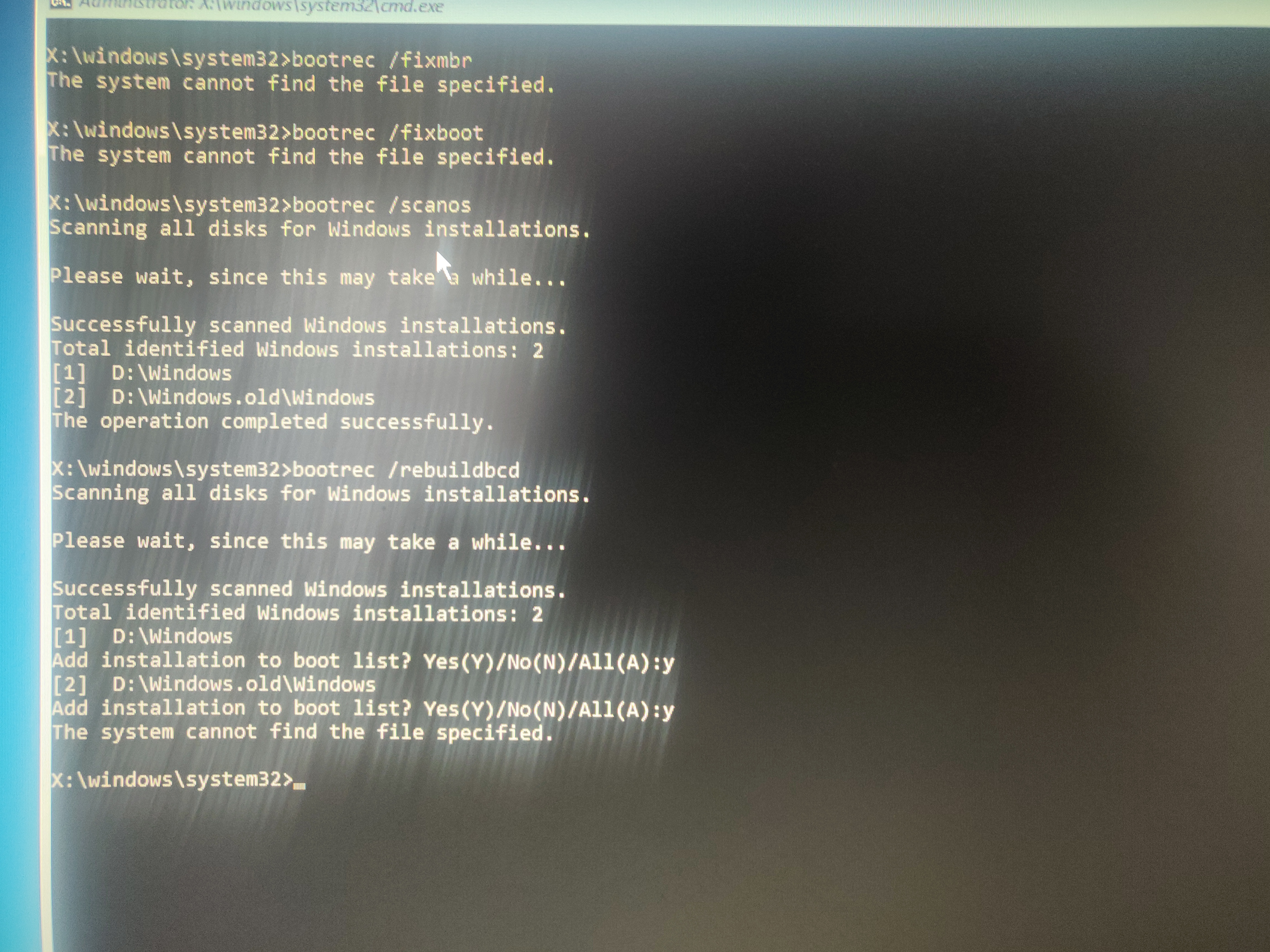 After trying all the options in the troubleshoot menu (all failed) I tried the solution of fixing the bootrec. Here is the output to those commands: