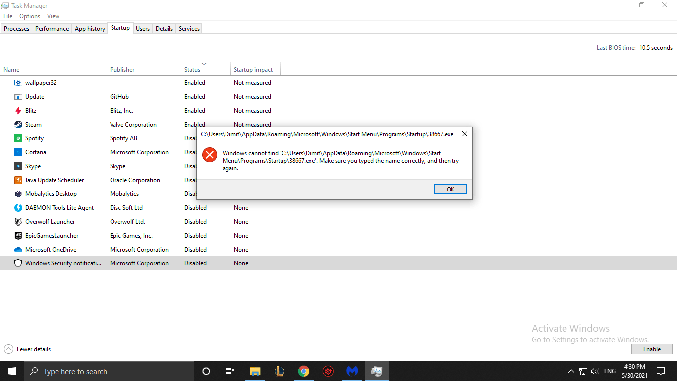 Every other minute i get this Windows cannot find C/users/****/AppData/roaming/microsoft/windows/starmenu/programs/startup/38667.exe error
