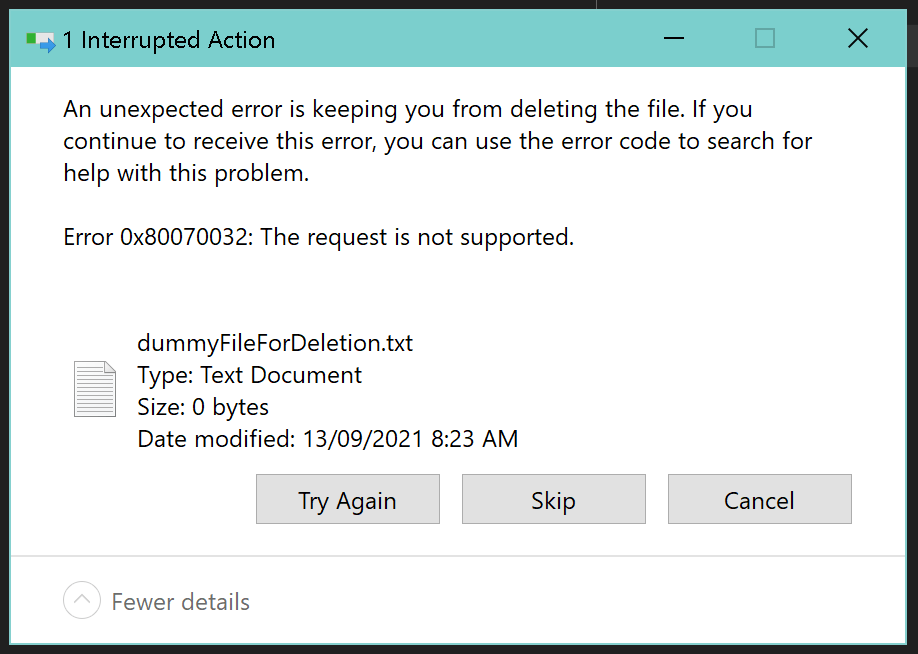 Unable to delete certain files from Windows Explorer. Error 0x80070032: The request is not supported.