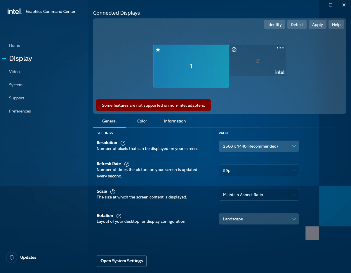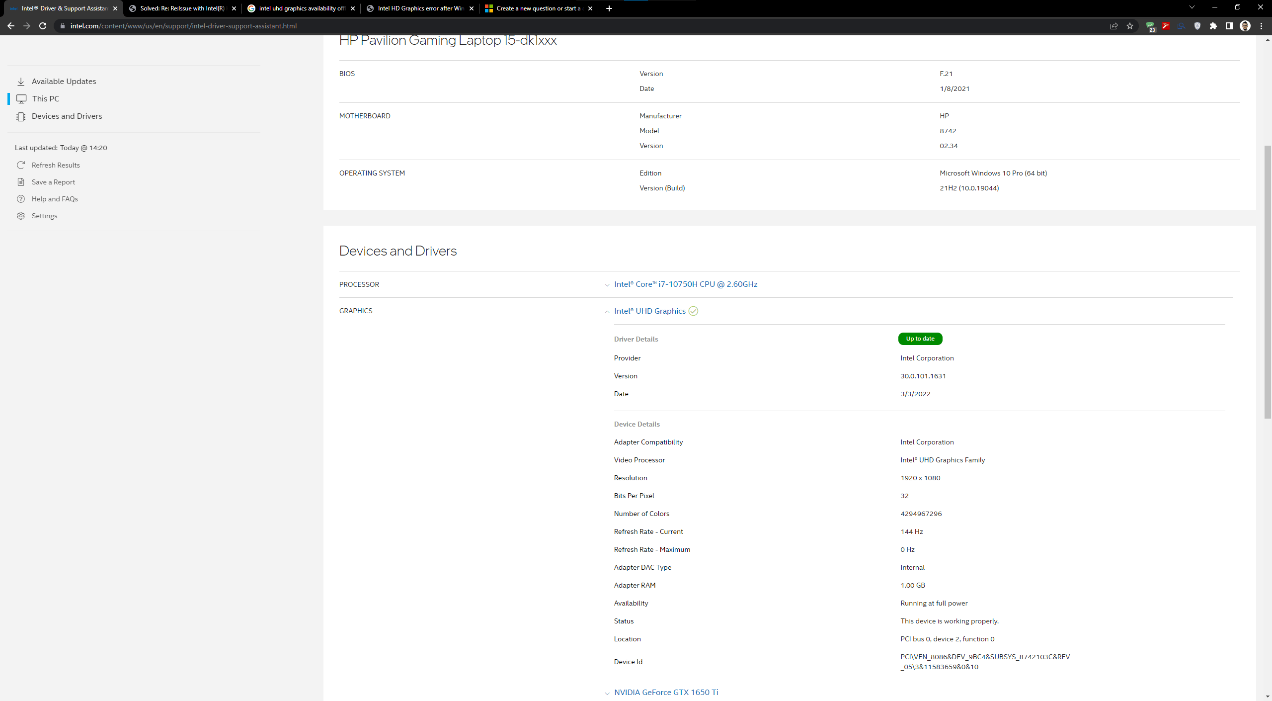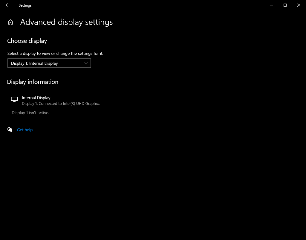 I have an issue about Windows 10 21H2 version with Intel UHD Graphic card. I have two monitor but internal monitor is not working. When I checked the advanced display settings, it shows "Display 1 isn't active" and I can't enable it with Intel Graphics Command Center. I can use only my external monitor over NVIDIA GTX 1650 TI graphic card.