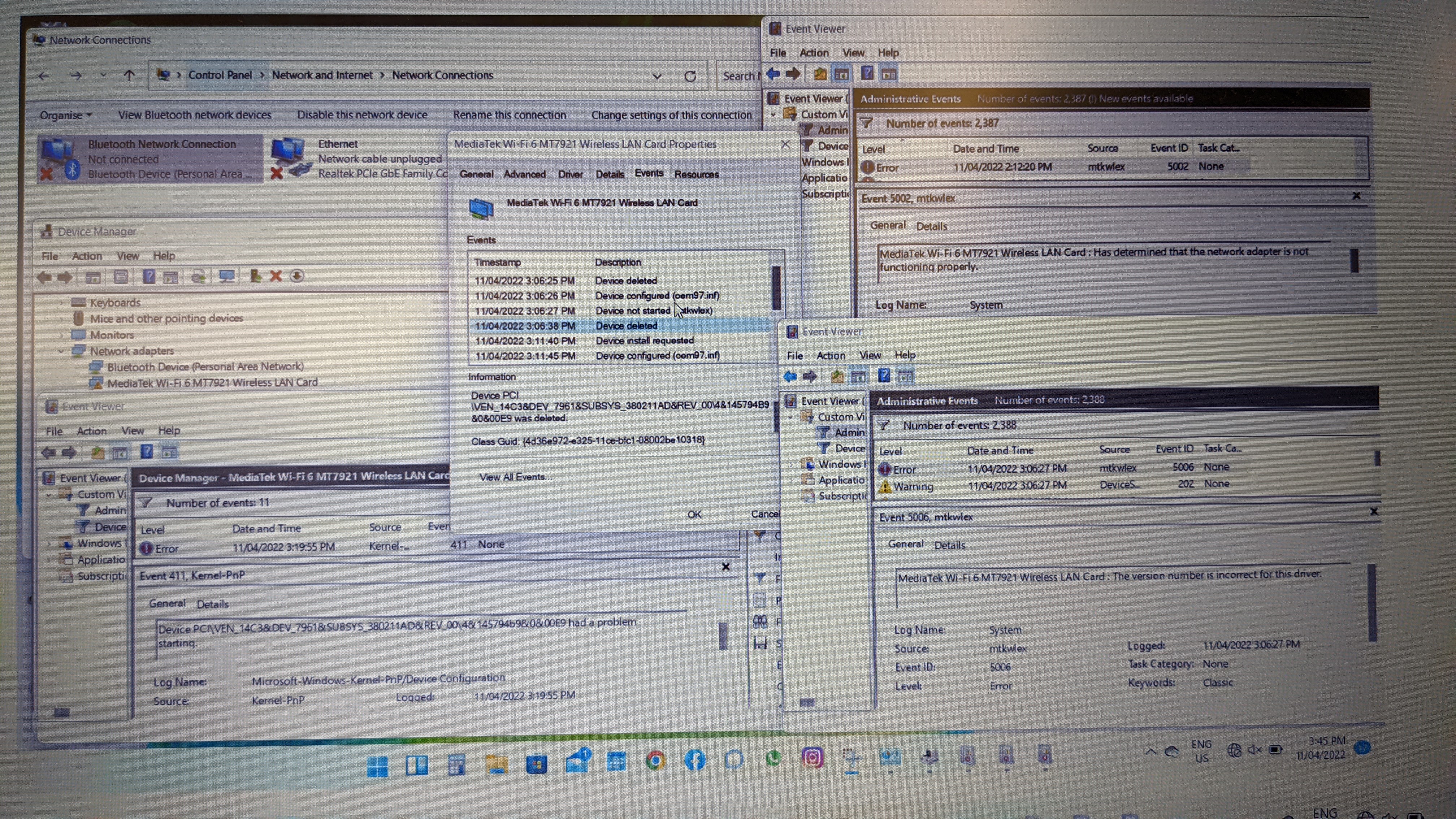 Secondly, I am looking for help too. It seems out of no where the windows adjusted my network adaptor. You can see the errors in my screenshot.