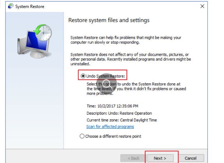 But whatever I do, I always land on the following error (see image). I don't have an "undo the system restore" option. It is driving me crazy, as the restore was a huge mistake and I regret it so much, having lost a lot of important data.