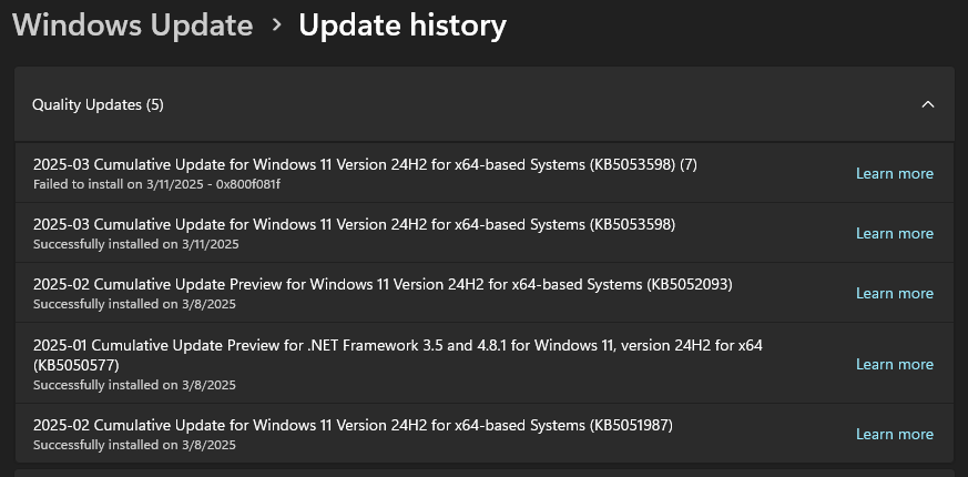 Error 0x800f081f denotes that some files in the CBS servicing folder are missing. A repair installation via Settings should resolve the issue.