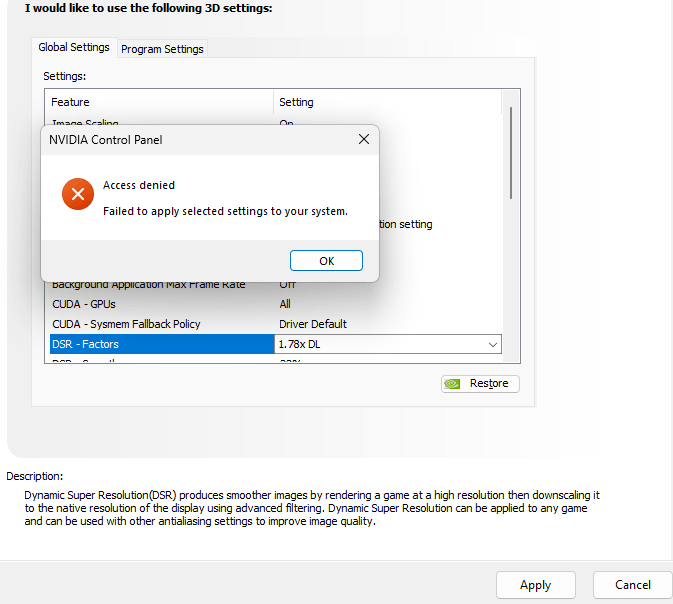 I also have this exact error message when I recently tried to perform any changes to the Nvidia app, Nvidia control panel, etc.