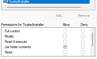I attempted to give TrustedInstaller and Administrator full control, but the option to do so is greyed out as seen in the following image.