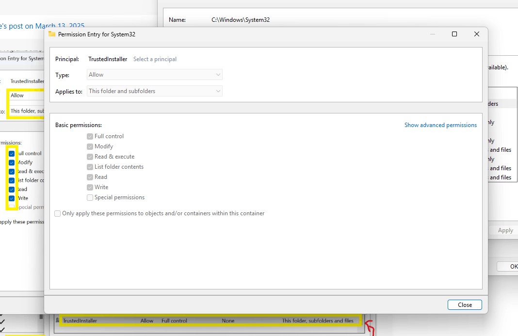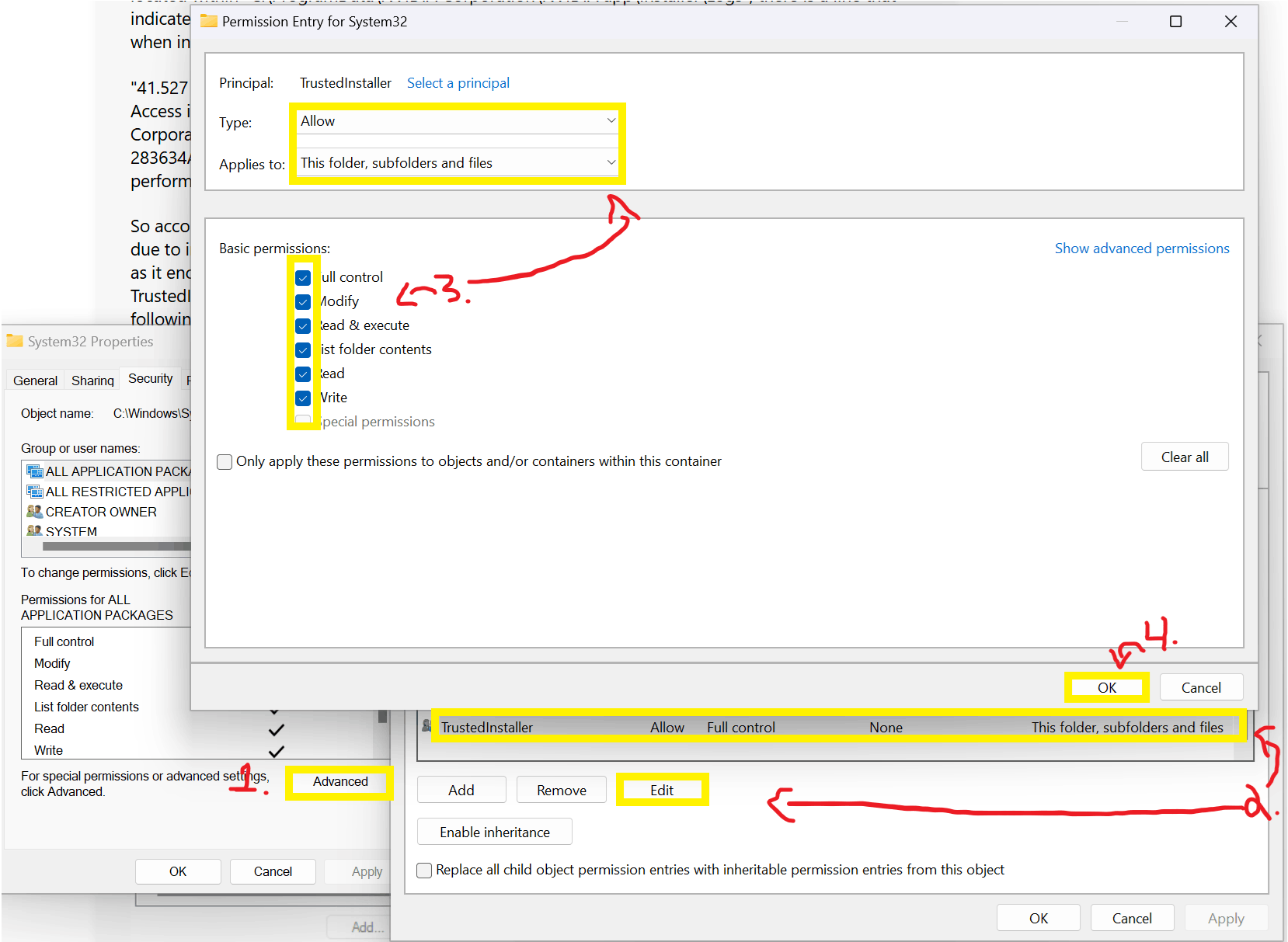 Try going to Windows folder, right-click on System32, select Properties. On the Security Tab, select Advanced, then select TrustedInstaller, select Edit. Make sure the "Type and "Applies to" matches the provided screenshot. Make sure "Full Control" Selected under the "Basic permissions" then click OK and apply for all.