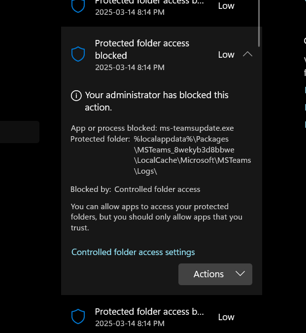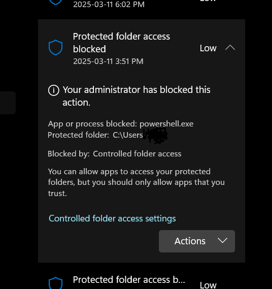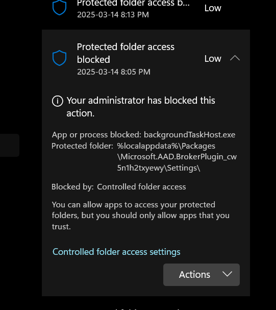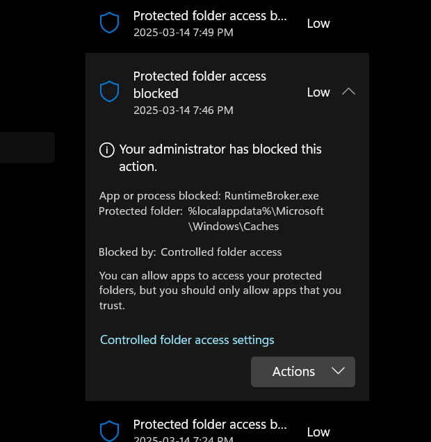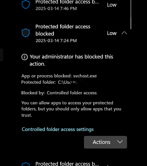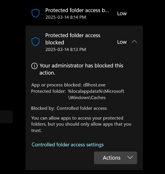 I have Windows 11 and keep getting notifications about executable files that are being blocked access to my controlled folders - this has been happening for years and is beyond frustrating. When I've done an online search for the filenames, to see if I need to be worried about viruses/malware, the results I get say that the files are Windows files. When I do an online search for why these files are being blocked, I see that a lot of people have asked this question too, but there aren't any results that actually explain what is happening. I've seen results for this forum, but haven't seen any answers that address it either. I would think that any Windows files would have access to my controlled folders without me having to give permission every time I get the notification. In the last 1/2 hour, I've gotten several of these notifications (normally I don't get a storm of notifications, so this is extra concerning). Out of sheer frustration, I've included screenshots of the protection history for several of these files, so hopefully, I can get some comprehensive explanation(s) as to what's going on.