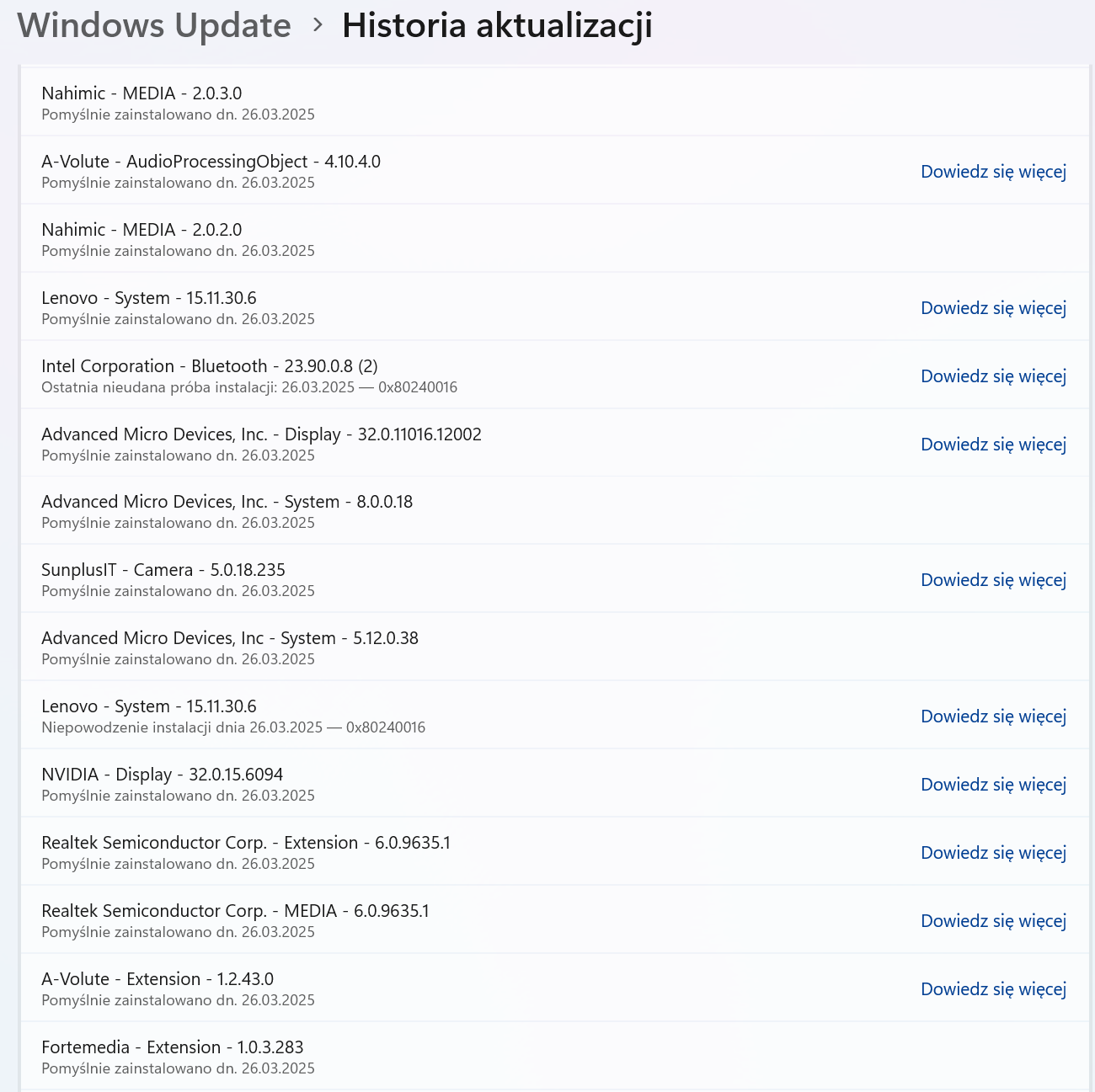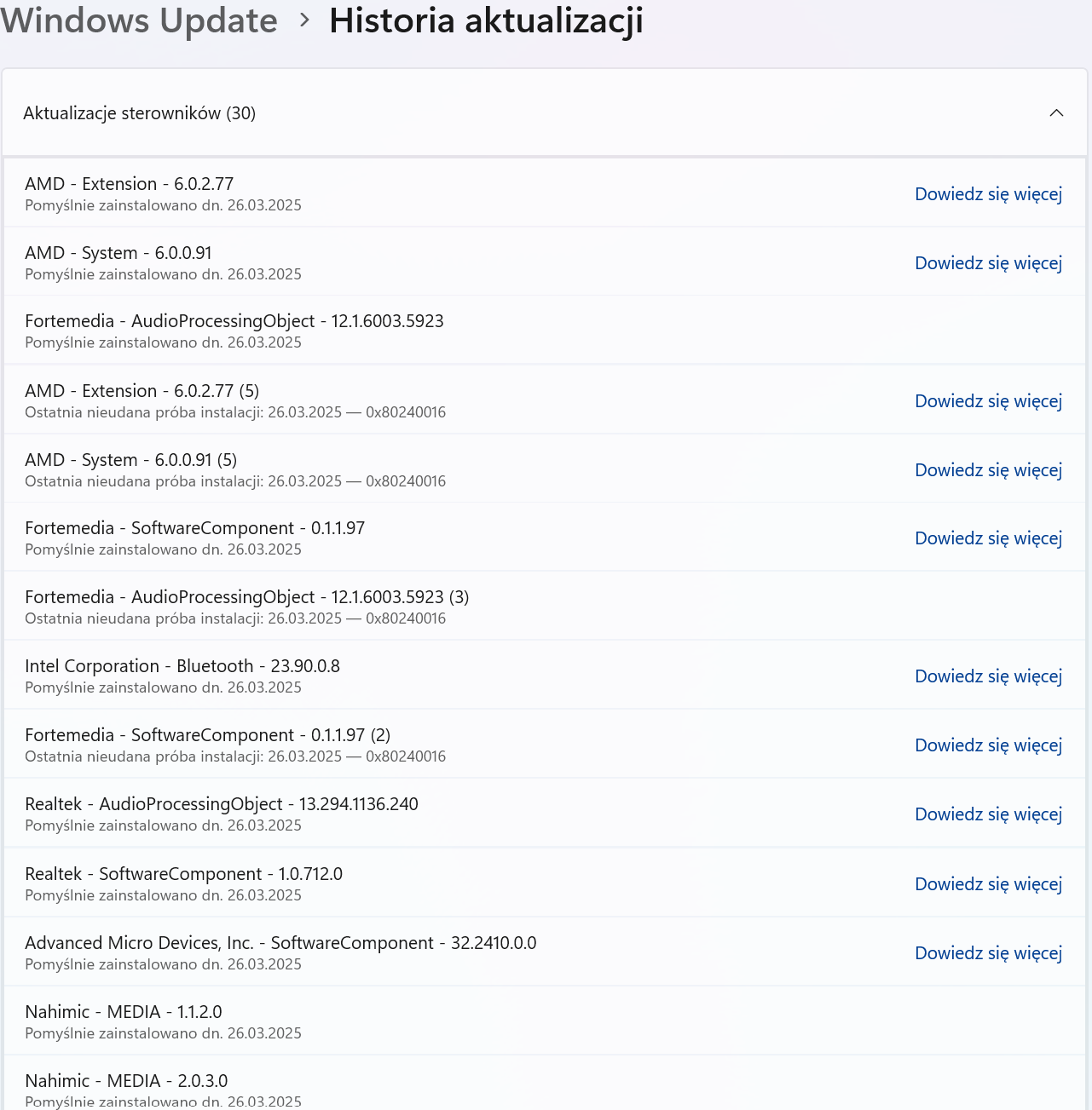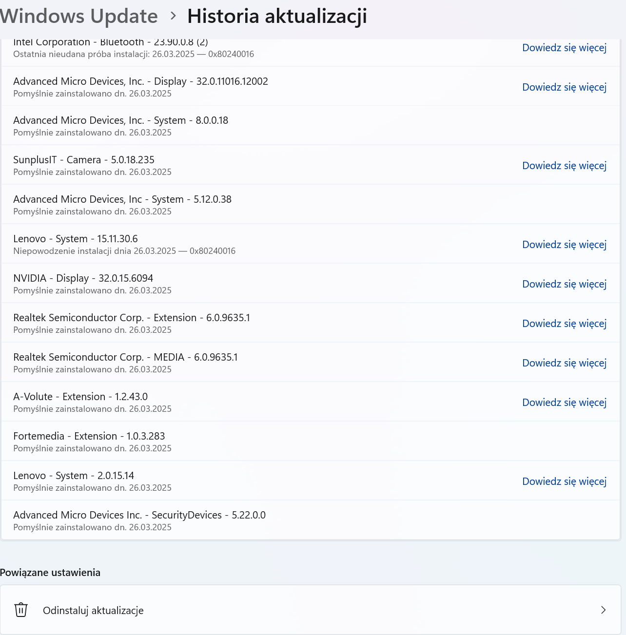 If you wish, you can try to perform a "clean uninstall process" of the driver and test an earlier version of the driver to check if the problem persists with an "older version" or "older combination". After the driver "package" is removed from the device, the driver cannot be installed by scanning for hardware changes. Please be careful to back up the driver installation files in advance.