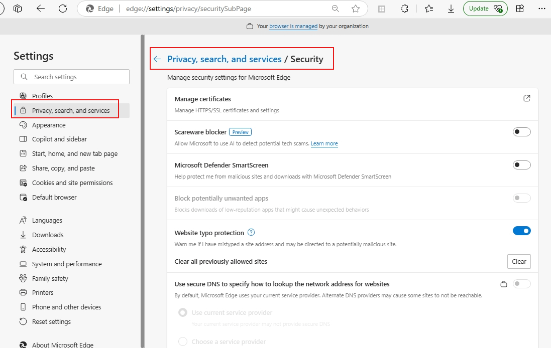In addition to the broad level of DNS configuration that can be adjusted in System Settings/Network Adapter, the browser itself may also have built-in options related to DNS and security checks.