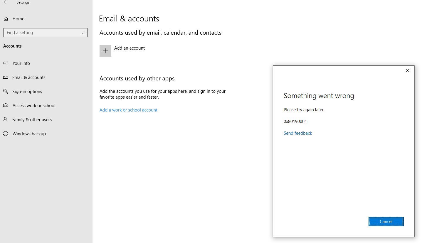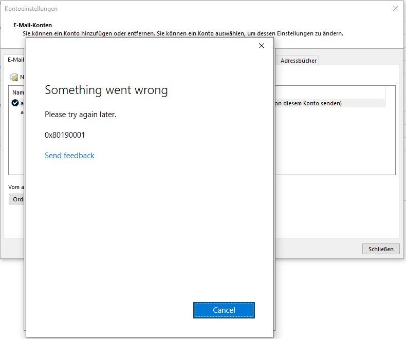 When I try to add a outlook.com e-mail account in my Outlook 2016 I get the error 0x80190001 too.