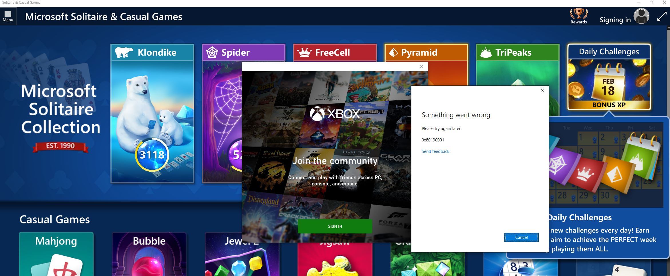 When I try to login I get the error 0x80190001