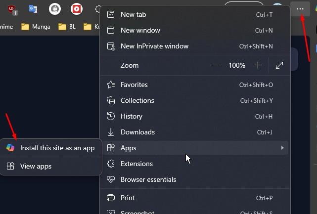 - Click the three-dots on the upper right of Microsoft Edge > Apps > Install this site as an app