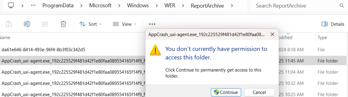 To gain access to the folder \?\C:\ProgramData\Microsoft\Windows\WER\ReportArchive\AppCrash_app.exe_..., even as an administrator, follow these steps: