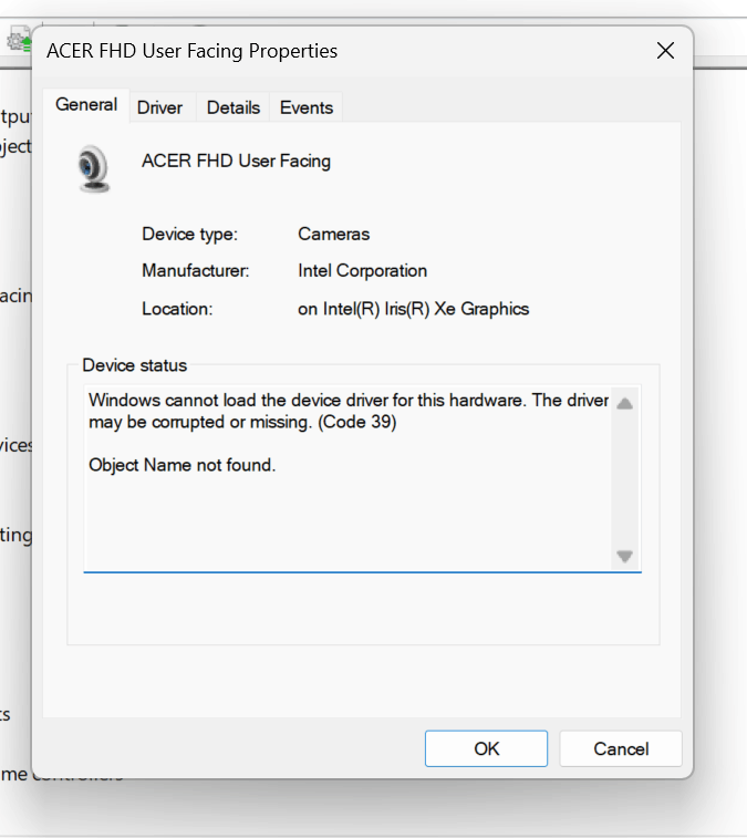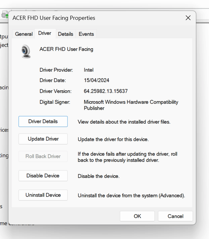 Did you try re-installing (not update) the version of Webcam drivers that Acer provide for your webcam on the support page for your laptop: