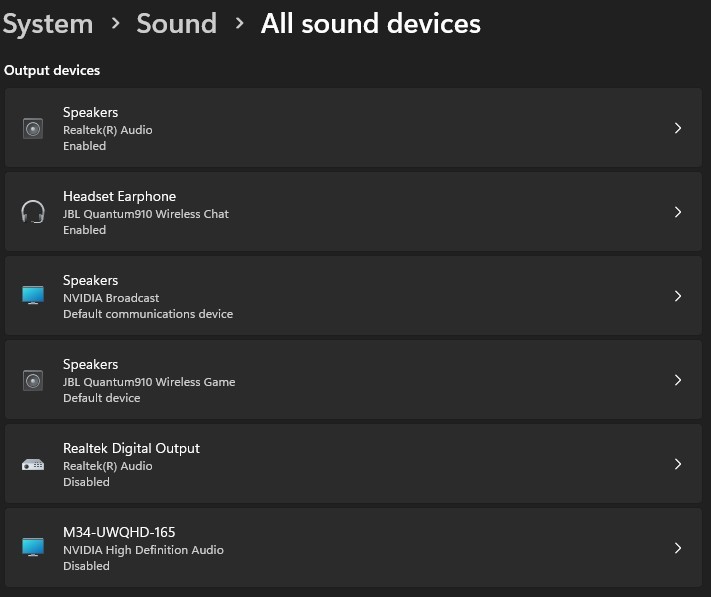 After installing the update Windows 11, version 24H2, I’m encountering an issue with my audio devices in Windows 11. A specific output device is visible under System > Sound > All sound devices, but it does not appear in the list of available outputs to select as my playback device. It's a gaming headset JBL 910 Quantum.