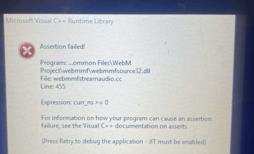 It looks like you're encountering an assertion failure in a program that uses the Microsoft Visual C++ Runtime Library. This specific error is related to the WebM Project and occurs in the webmmfstreamaudio.cc file at line 455, with the expression curr_ns >= 0 failing.