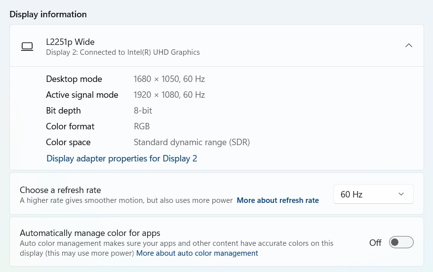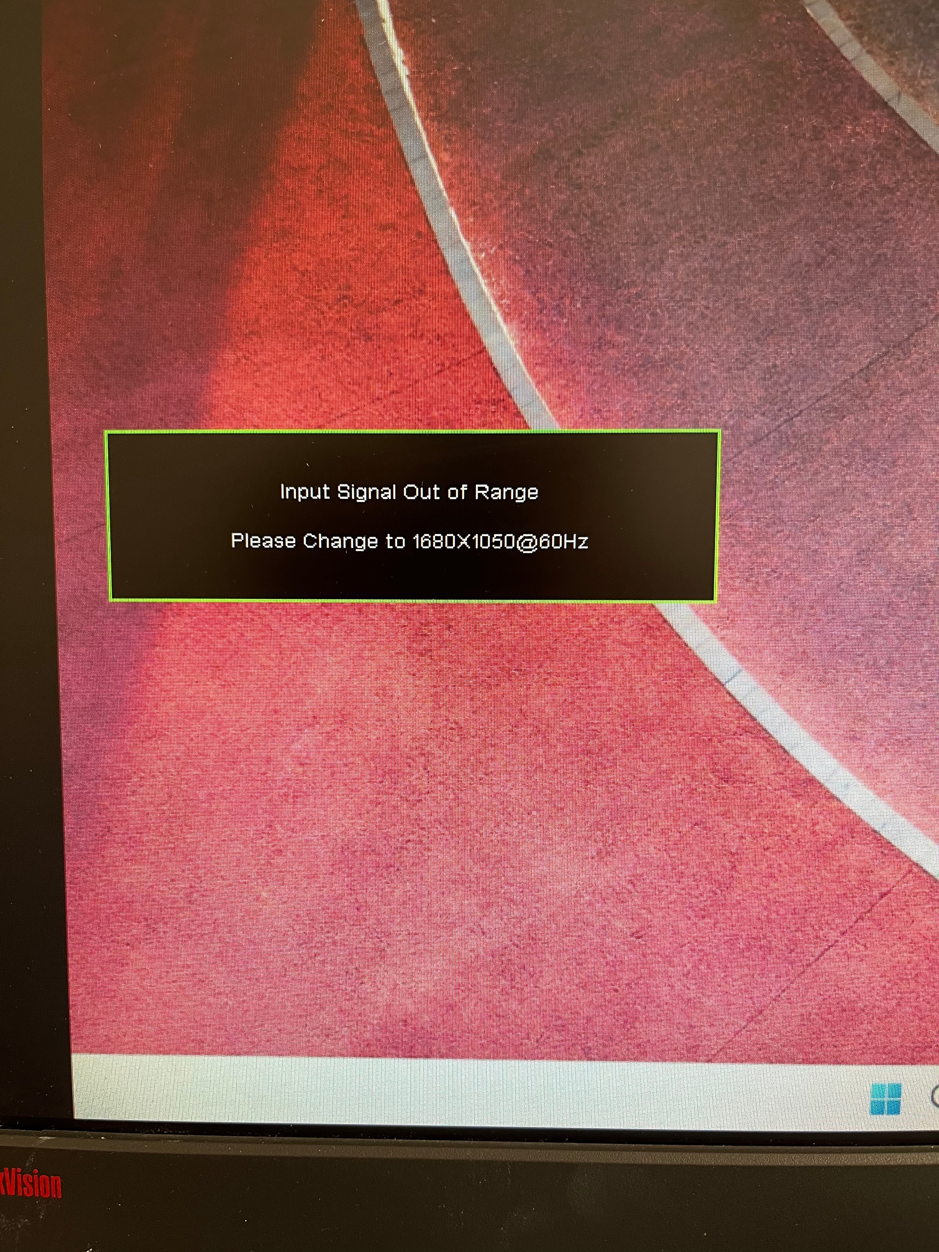 I've connected a second screen to my laptop (Windows 11 Pro), but I keep getting the message 'Input Signal Out of Range. Please change to 1680x1050 @ 60Hz,' even though I have already set that resolution.