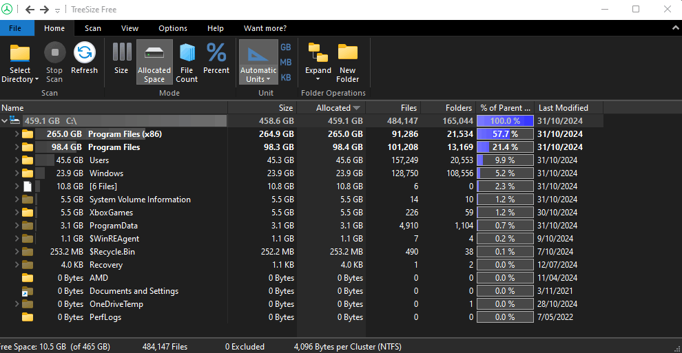 Please provide a screenshot of your C drive in that TreeSize utility, so I can see your hard drive and work out where that space is being used and if there is an underlying problem.