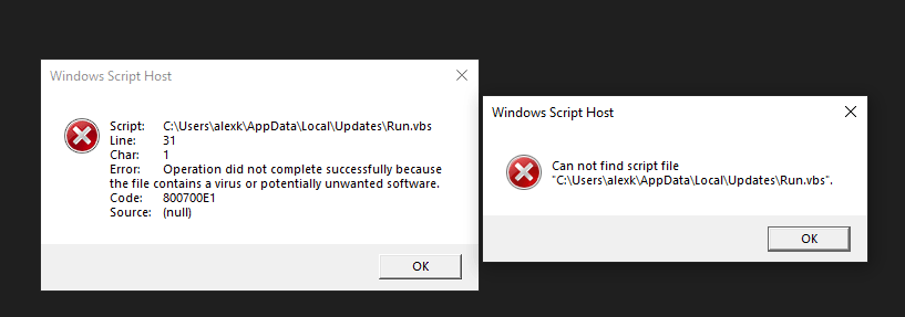 I started getting this message every time I load up my PC, I got a WSH error code 800700E1. I tried looking it up in Microsoft Community and found something similar that said to delete the Run.vbs file and restart.