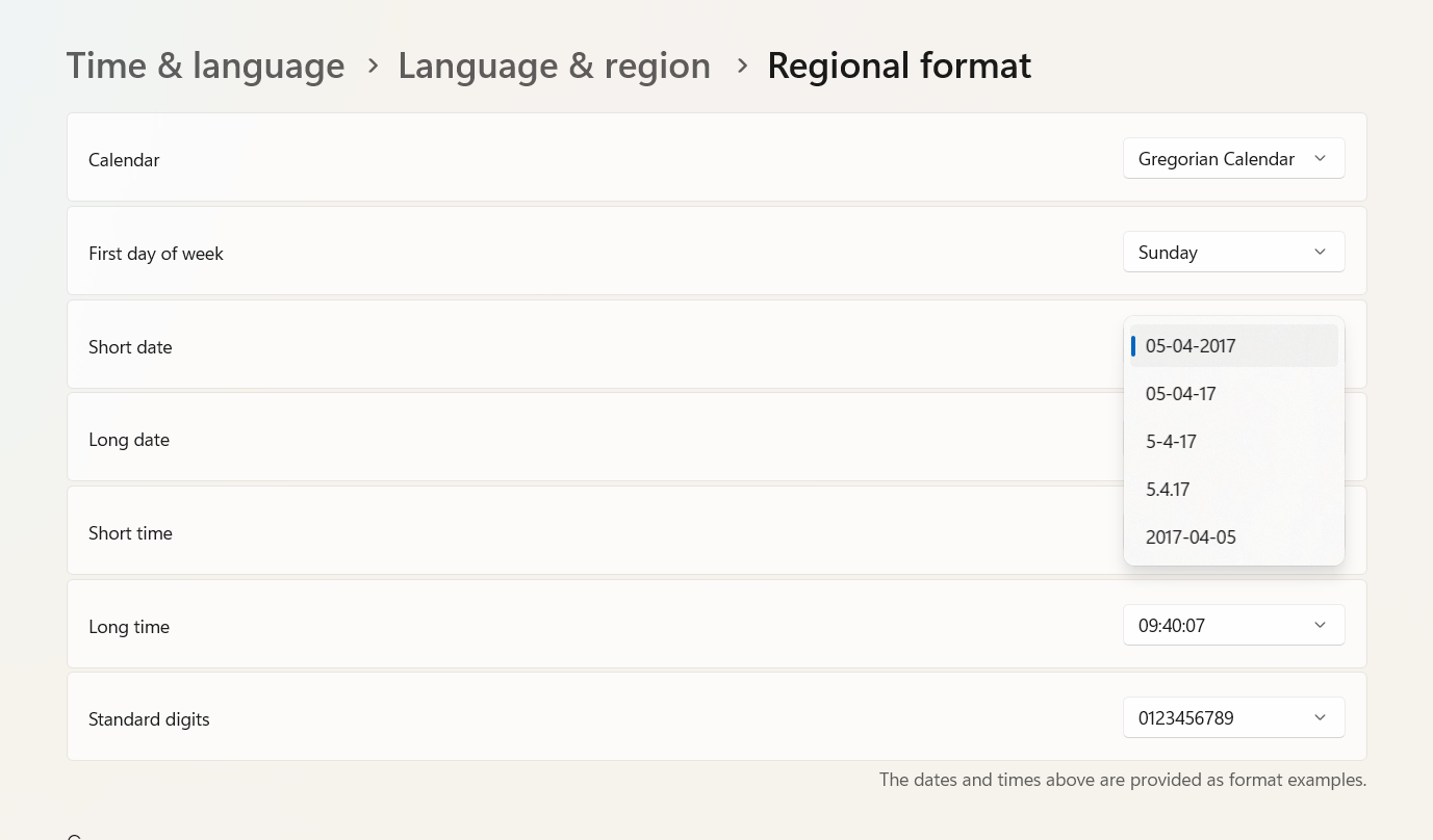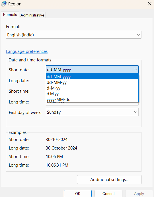 Under Short date, select the desired format (e.g., dd-MMM-yyyy for 22-Oct-2024).