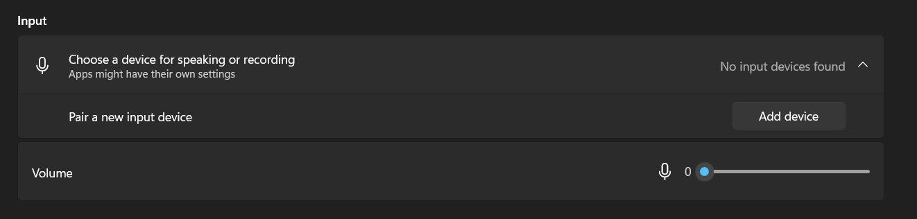 Thank you for the screenshots. It seems that your Microphone (input) is no longer detected on your laptop device. If the input settings say 'No devices found', it means that the required drivers for the Microphone are not installed properly.