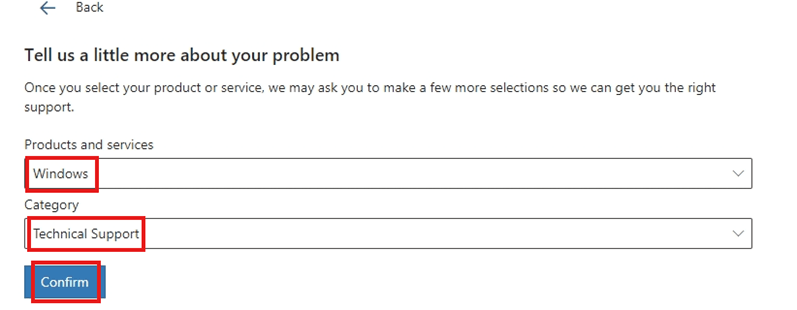 5 Select Windows in Products & Services, then select Technical support in the category, then click the Confirm button below