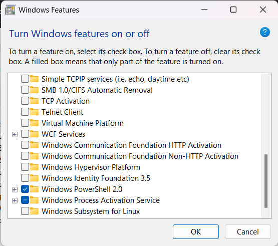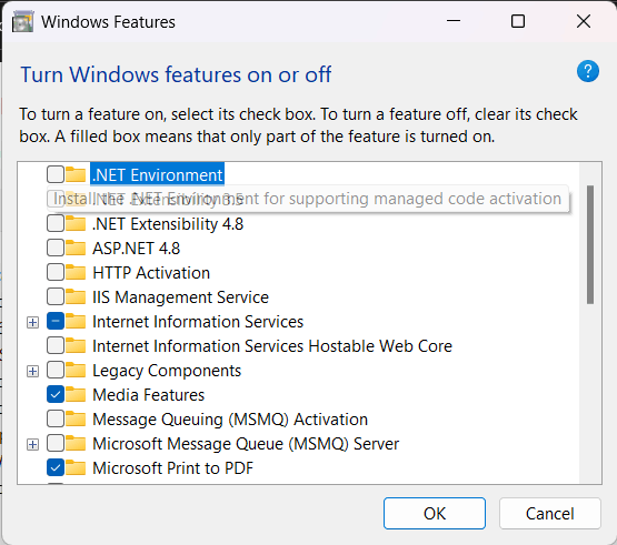 • In the Windows Features dialog, locate the .NET Framework entries (such as .NET Framework 3.5 (includes .NET 2.0 and 3.0) or .NET Framework 4.x).