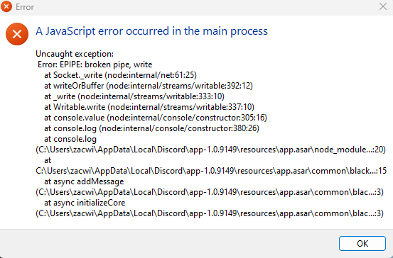 2024-06-14T11:59:13+00:00 The error message you provided indicates a problem with Discord, specifically a JavaScript error related to writing to a broken pipe. Try deleting Discord's AppData files if you have one. It might be a corrupted file within the AppData files.