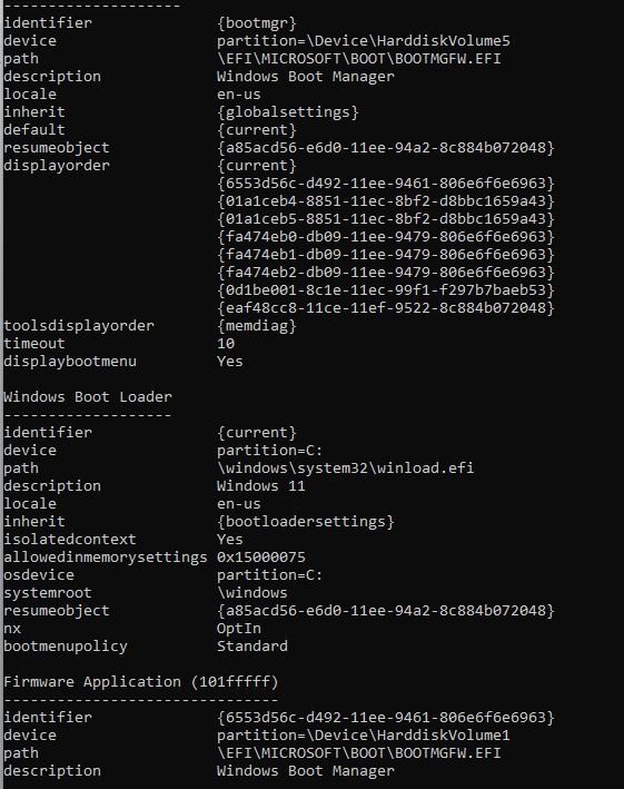 Can't say I understand what I'm looking at. for example, the bootmgr identifier device states 'HarddiskVolume5' - Volume 5 ?
