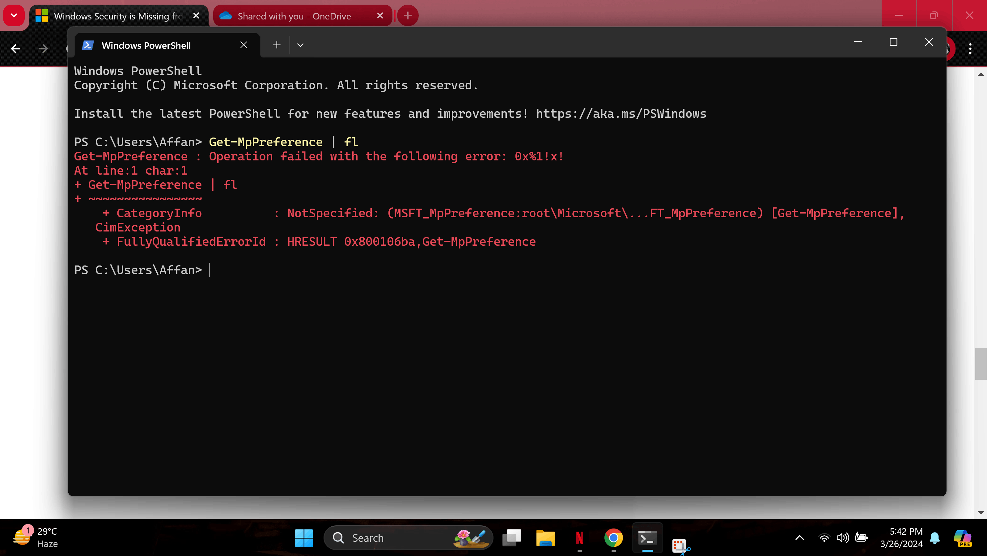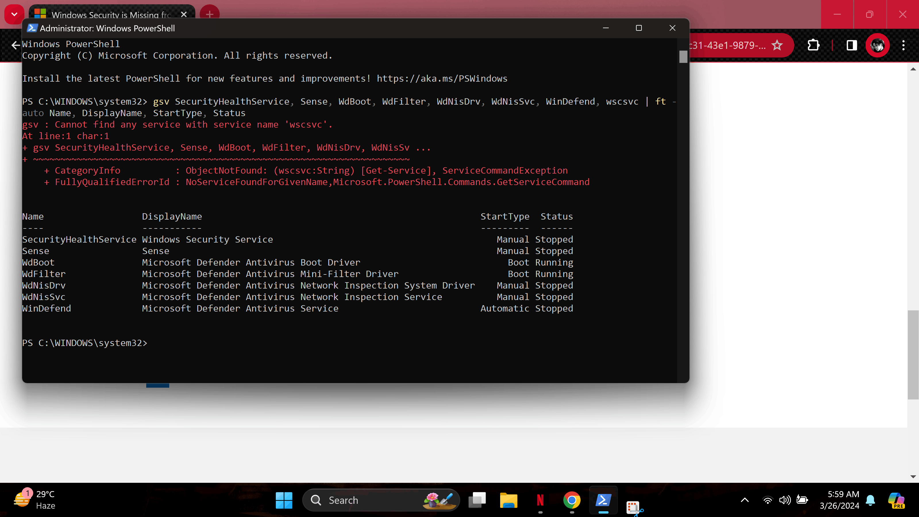 windows security is still acting blank and the power shell command shows this:
