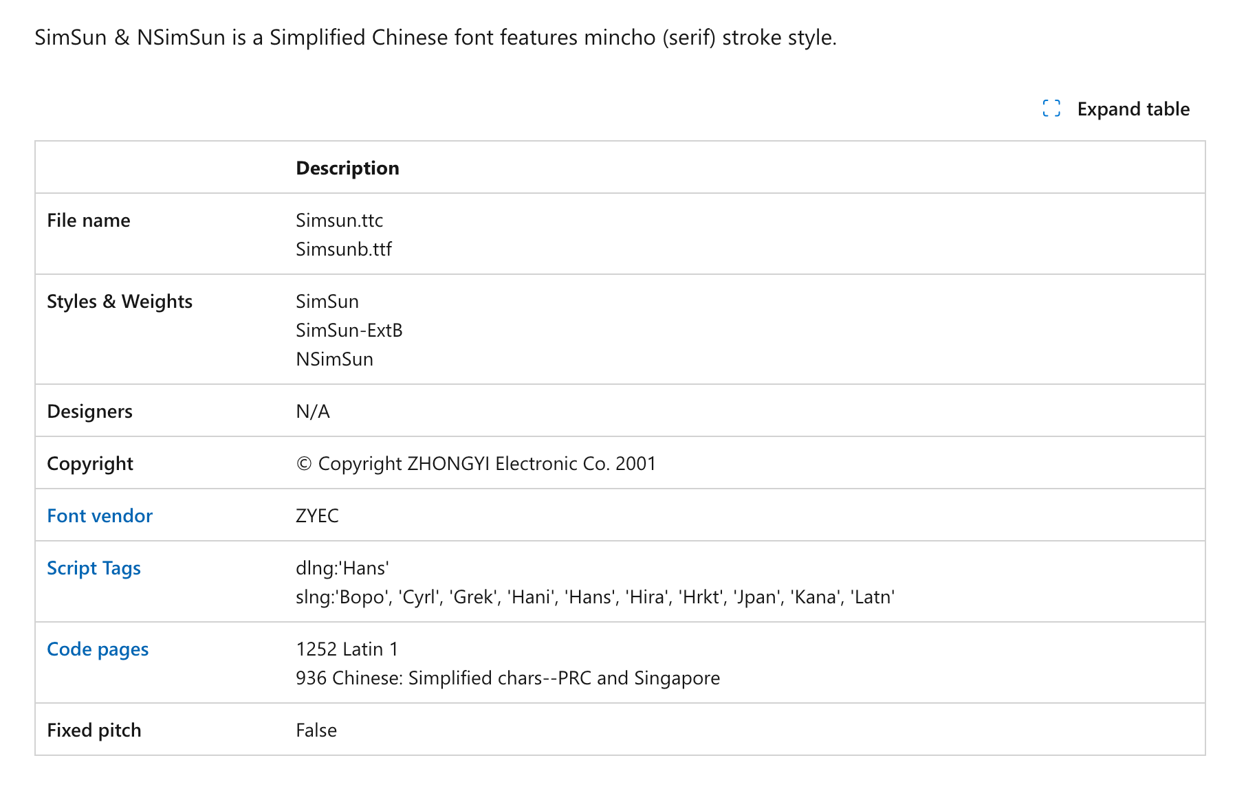 So while this is also for general knowledge of Windows supplied fonts, the font in particular here is SimSun, but the info page for that font from here: https://learn.microsoft.com/en-us/typography/font-list/?source=recommendations list the font as below: