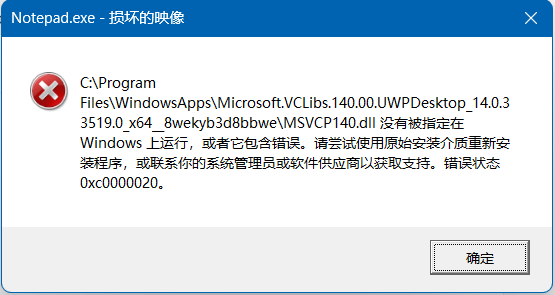After reinstalling, I excitedly opened Notepad, but an error still occurred, the same error as above.
