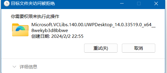 After that, I took a closer look at his path, which is the file "C:\Program Files\WindowsApps\Microsoft.VCLibs.140.00.UWPDesktop_14.0.33519.0_x64__8wekyb3d8bbwe\MSVCP140.dll". I think I deleted him directly, but the system prompted me that I didn't have permission. (And there seems to be a problem with the input board of this community. I can't paste some content into the text box with Ctrl+V. I don't know why. I can copy and paste normally)
