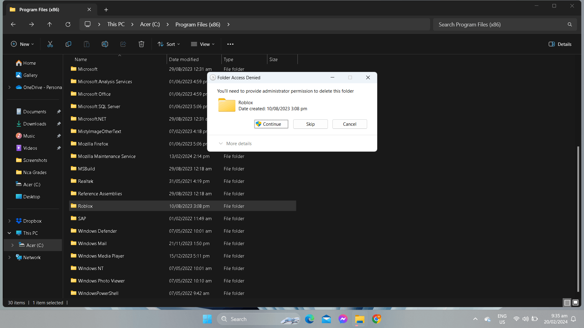 It seems your account does not have admin rights. If you click on "Continue" will the file be deleted?