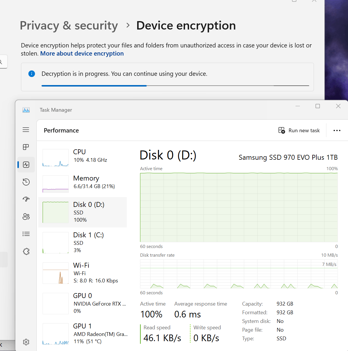 It may be an expected situation for the decryption process to take a long time and affect the performance of the drive.