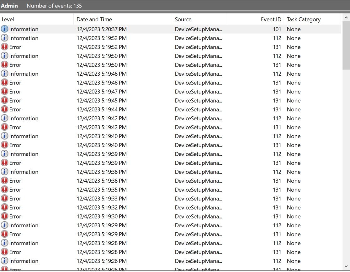 The problem you describe may be caused by a device enumeration problem with the Windows Device Set-up Manager during system startup. Specifically, an Event ID 131 error usually indicates that some error or timeout occurred during the device enumeration process. This can be related to the loading of a device driver, a change in device connection status, or other system configuration issues.